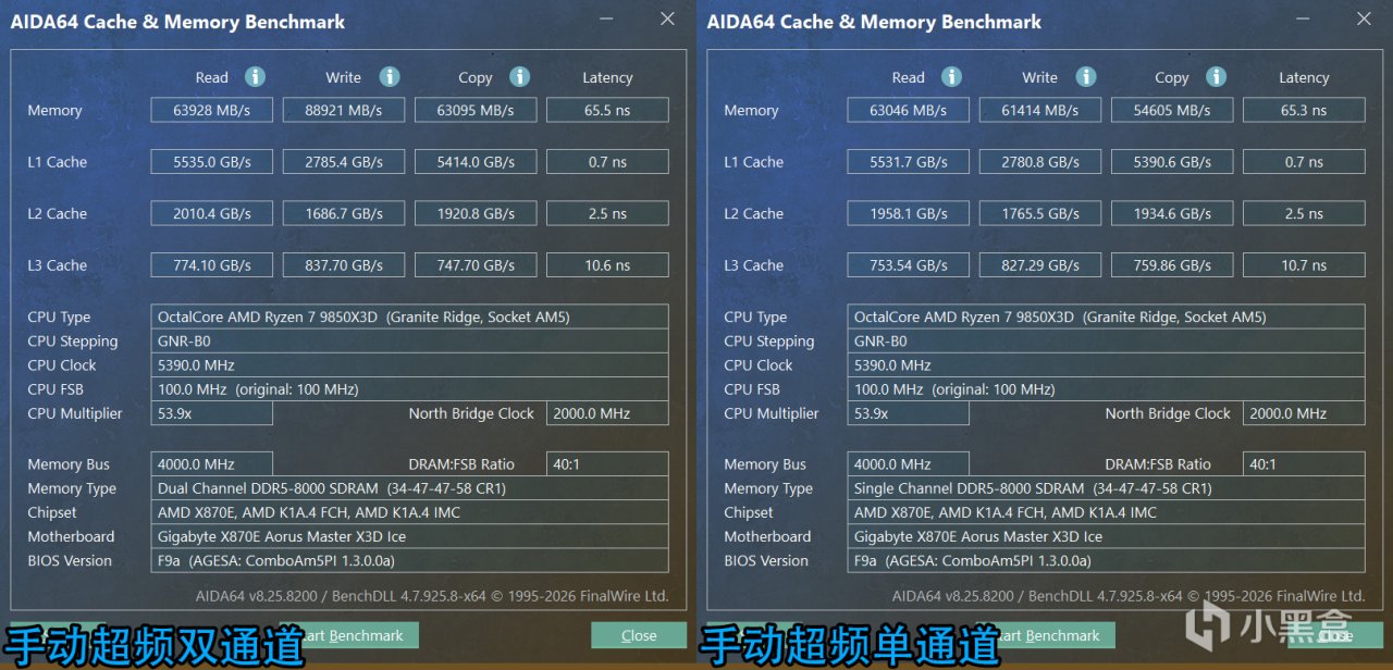 ↑女武神二代DDR5 8000C34,AIDA64 手動超頻雙通道VS單通道