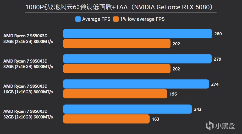 這裏多提一嘴,《騎馬與砍殺2》也擁有大戰場,但是它的側重點在於單核性能決定幀數上限,大緩存來兜底,確保1% LOW幀足夠高,所以對於9850X3D超內存通常只能提升1% LOW幀。