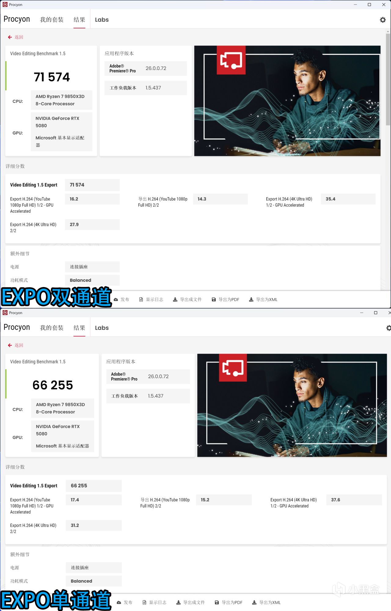 ↑女武神二代DDR5 6000C28,Procyon Video Editing Benchmark 1.5 EXPO雙通道分數爲71574,單通道爲66255