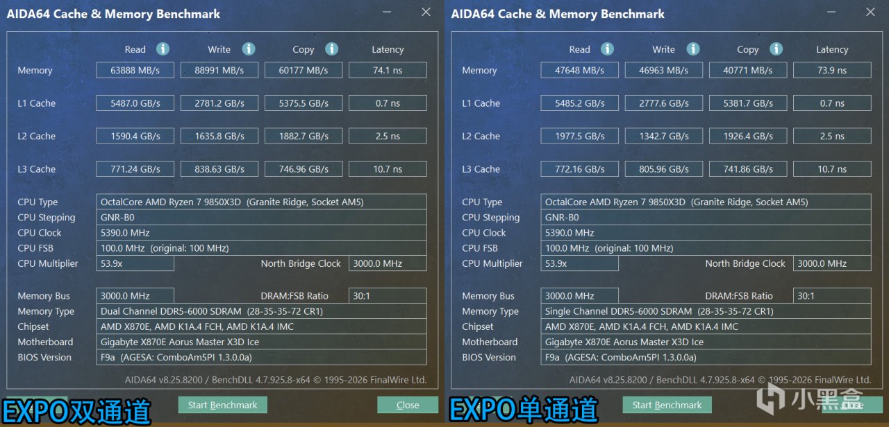 ↑女武神二代DDR5 6000C28,AIDA64 EXPO雙通道VS單通道