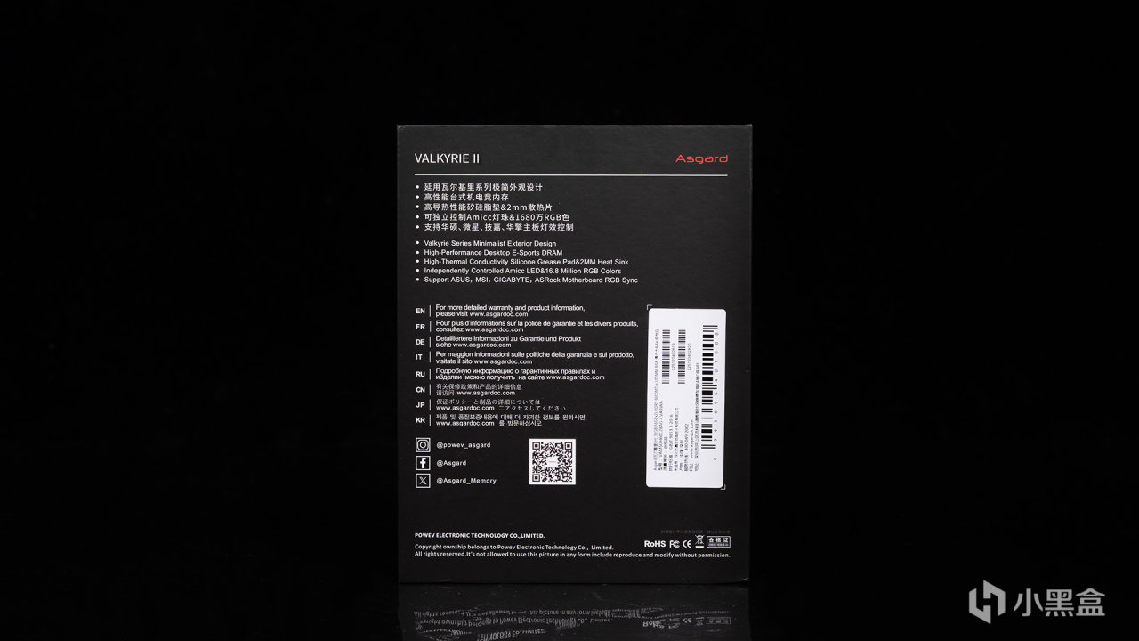 包裝背面標註了女武神二代相關賣點,比如系列簡潔外觀、高導熱硅脂墊&2mm散熱片、可獨立控制Amicc燈珠、主板燈光體系支持等,下方還有多國語言簡要說明和官方媒體號標註。