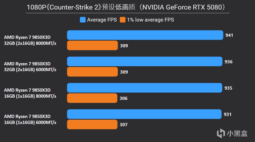 另一方面,對於《CS2》這種數據體量不大的電競遊戲(包括《絕地求生》),巨大L3緩存已經可以包容在內,因此單雙通道、超頻與否幀數表現都是幾乎一致並不影響。