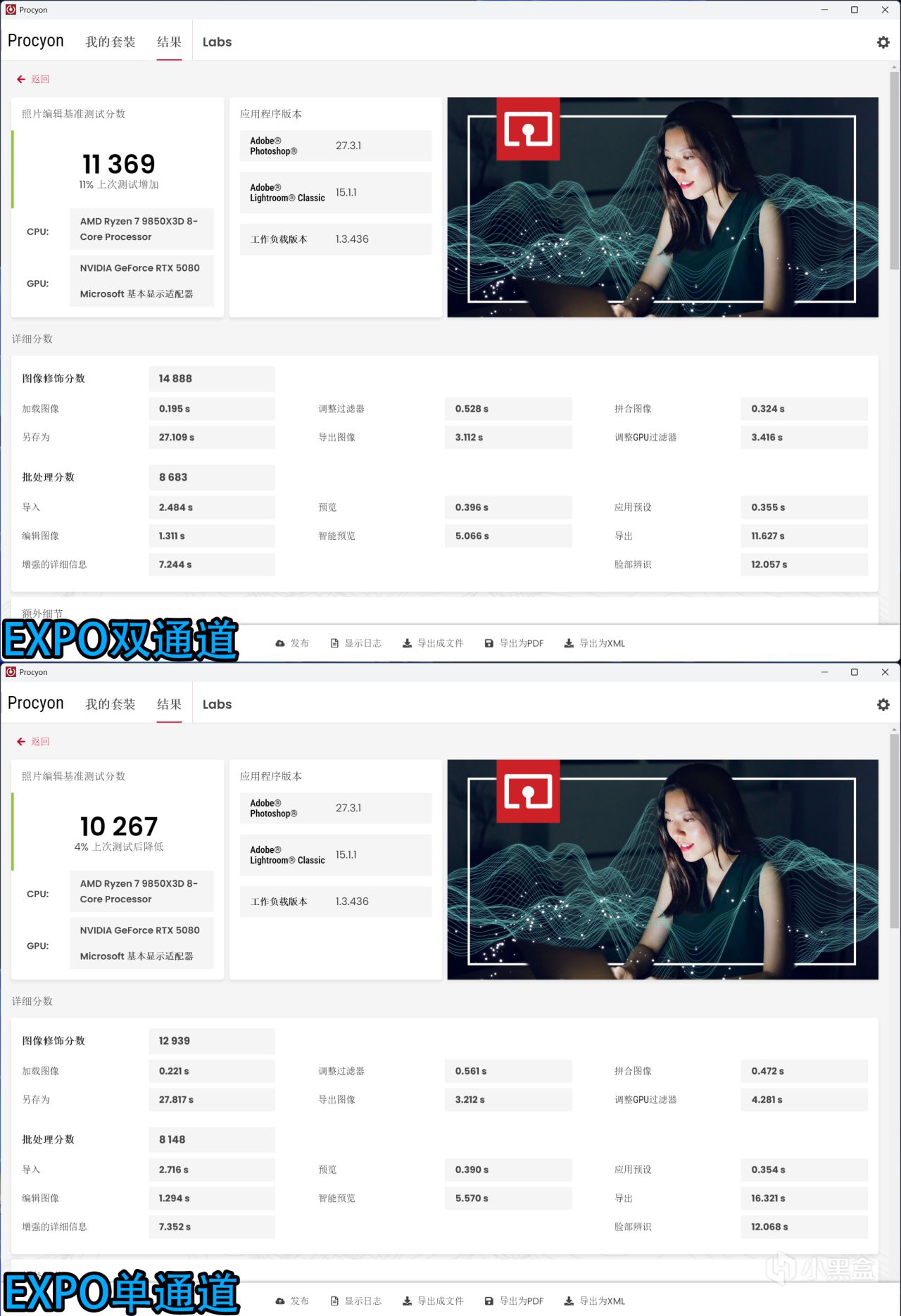 ↑女武神二代DDR5 6000C28,Procyon照片編輯基準EXPO雙通道分數爲11369,單通道爲10267