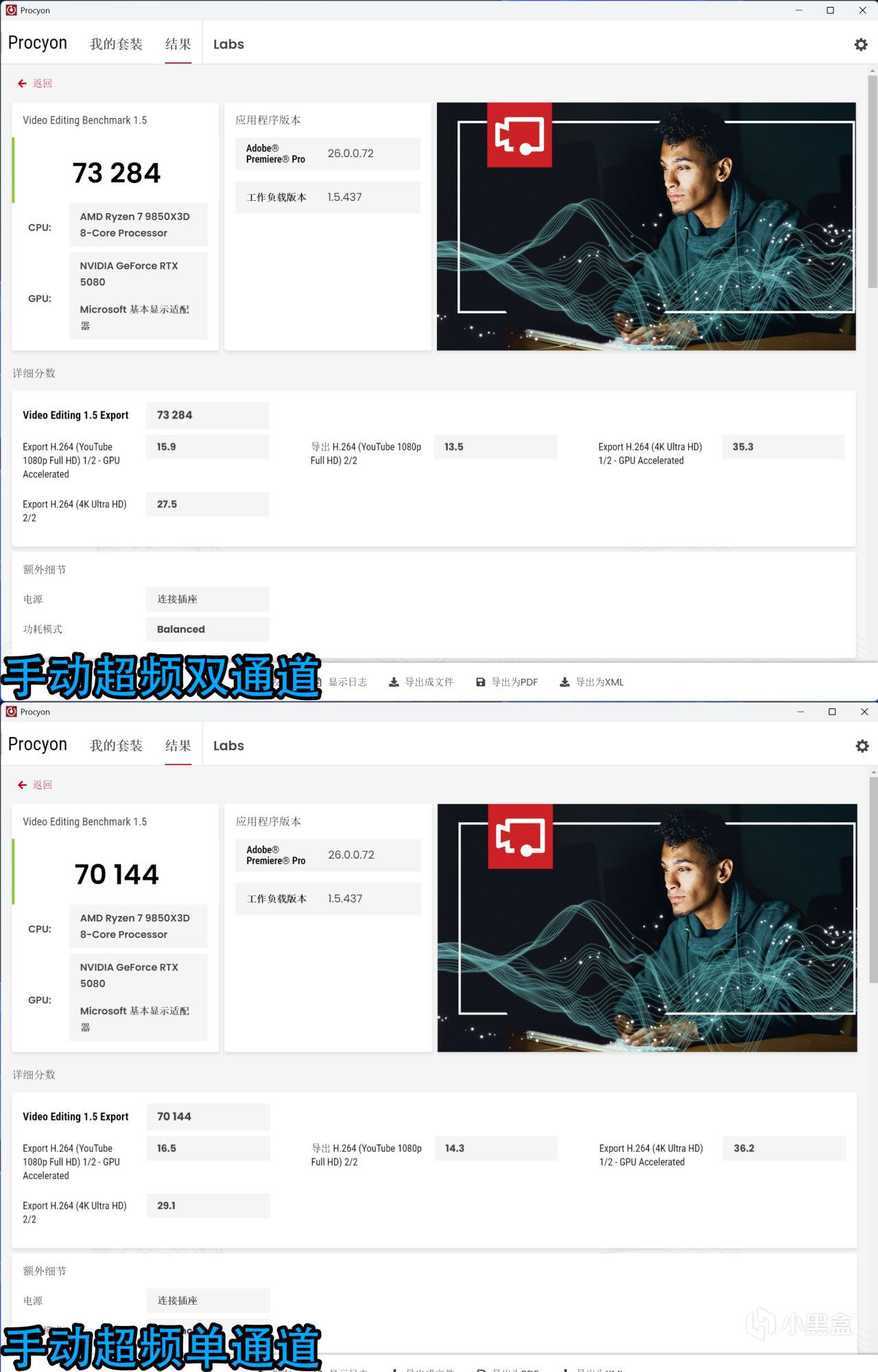 ↑女武神二代DDR5 8000C34,Procyon Video Editing Benchmark 1.5 手動超頻雙通道分數爲73284,單通道爲70144