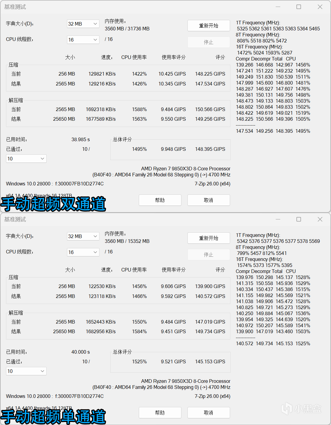 ↑女武神二代DDR5 6000C28,7-Zip EXPO雙通道VS單通道