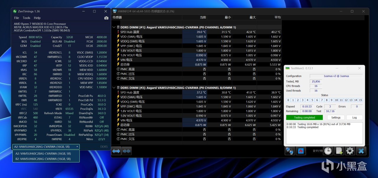 首先直接探究一下女武神二代DDR5 6000C28手動超頻潛力,一番折騰之後,最終能達到DDR5 8000C34-47-47-58,副時序和第三時序均可優化到位,VDD和VDDQ電壓均設定1.6V。在額外散熱風扇輔助下,可烤機通過TestMem5 V3@1usmus配三輪,兩根內存最高溫度分別爲37℃和39℃,確實是海力士A-Die顆粒的常見表現。