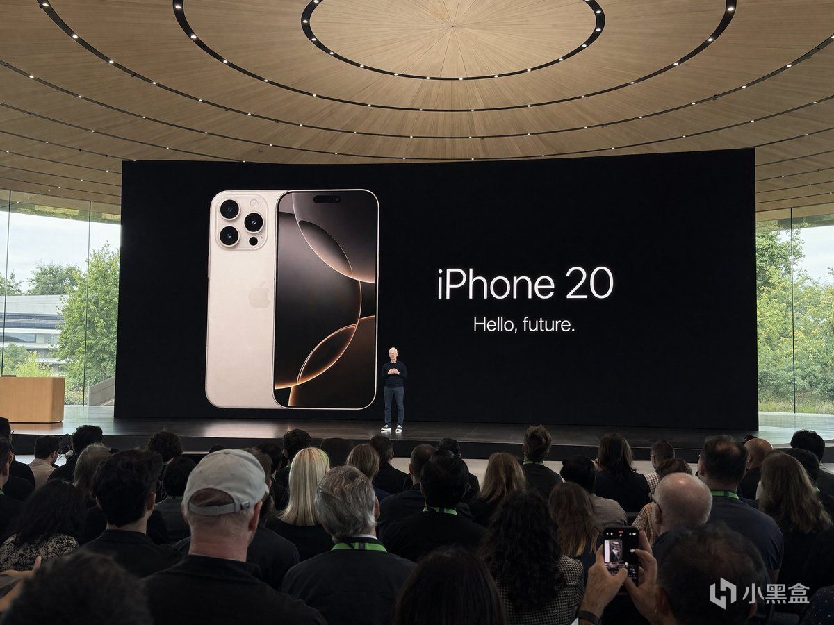 Amateur iPhone photo at Apple Park during the iPhone 20 keynote, Tim Cook presenting on stage. Shot from the crowd at a distance