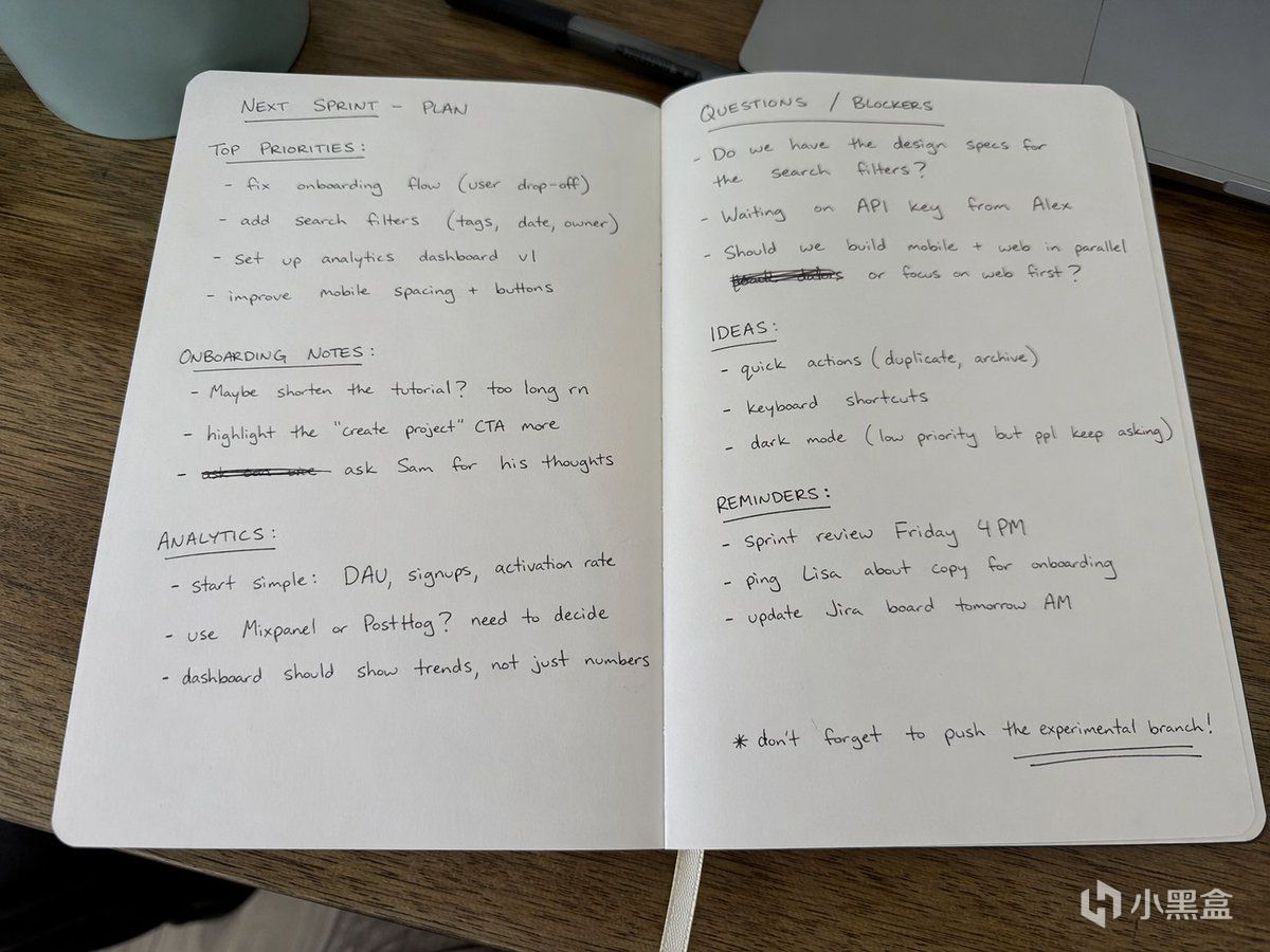 Amateur photo of an open notebook lying flat, filled with handwritten notes in black ballpoint pen. The handwriting is casual and slightly messy, like personnal notes, natural imperfections, crossed out words, underlined headings. Shot from slightly above, natural daylight from a window, no flash. Casual desk setting, shot on iPhone