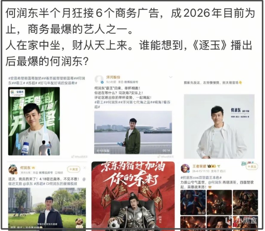 有網友統計,何潤東憑藉此次翻紅,短短半個月就拿下6個商務廣告。儘管多爲借熱度的短期代言,但這樣的速度在內娛也實屬少見。