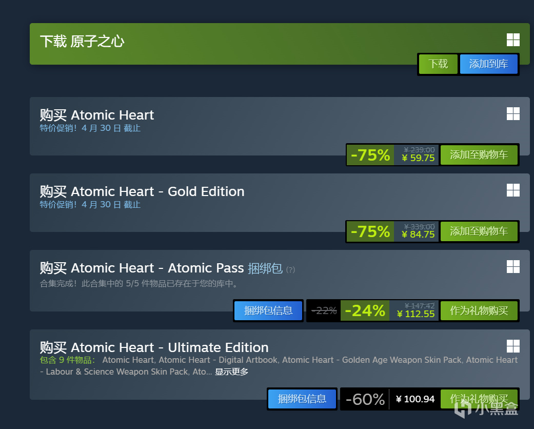 《原子之心》现在也开启了新的折扣,非常推荐购买一步到位的终极版,包含全部的4个剧情DLC以及美术集,还有着-60%的优惠价格,仅需100.94元。