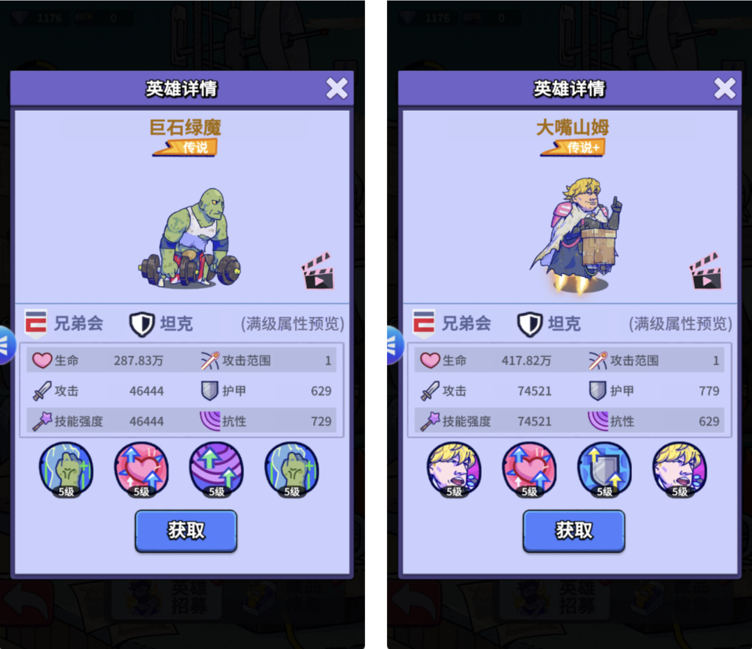 在英雄养成体系上,《疯狂水世界》则通过细化稀有度,巧妙控制了平民与中小R玩家的差距。游戏中作为队伍主力的橙色英雄被细分为了“传说”和“传说+”两档,数值上差异较大。