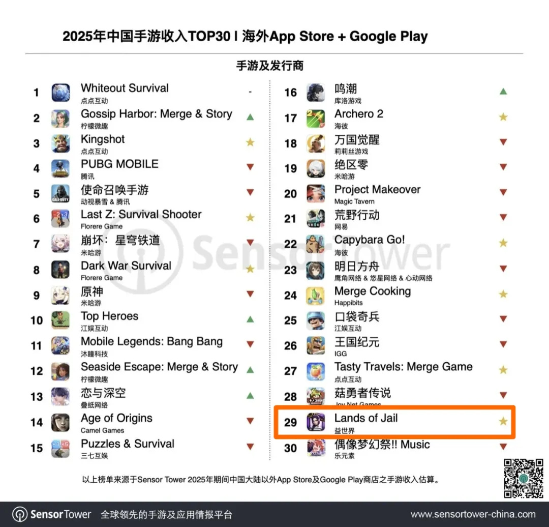 这些精心设计配合益世界成熟的买量运营策略,最终使《Lands of Jail》取得了惊人的营收成绩,跻身2025年中国出海手游收入TOP30之列。