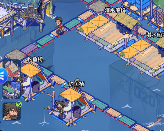 当积累了足够的资源后,游戏会指导玩家建造钓鱼椅、拾荒船、潜水船坞这三种能通过小游戏批量获取资源的建筑。