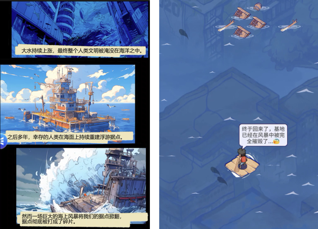 这一背景设定借鉴了经典科幻影视作品《未来水世界》的灵感,与市面上“三国”、“架空历史”、“近未来”等常见SLG题材相较,观感上显得更加新颖。而游戏开局“重建被毁家园”这一桥段,在深化玩家代入感的同时,也天然适合后续游戏模拟经营玩法的展开。