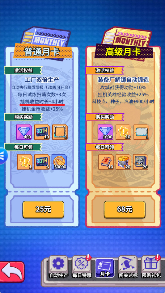 以上面提到的挂机模块为例,零氪玩家只能累积8小时的收益(月卡玩家为12小时),而且不能通过消耗付费货币“买时间”提前获取资源。