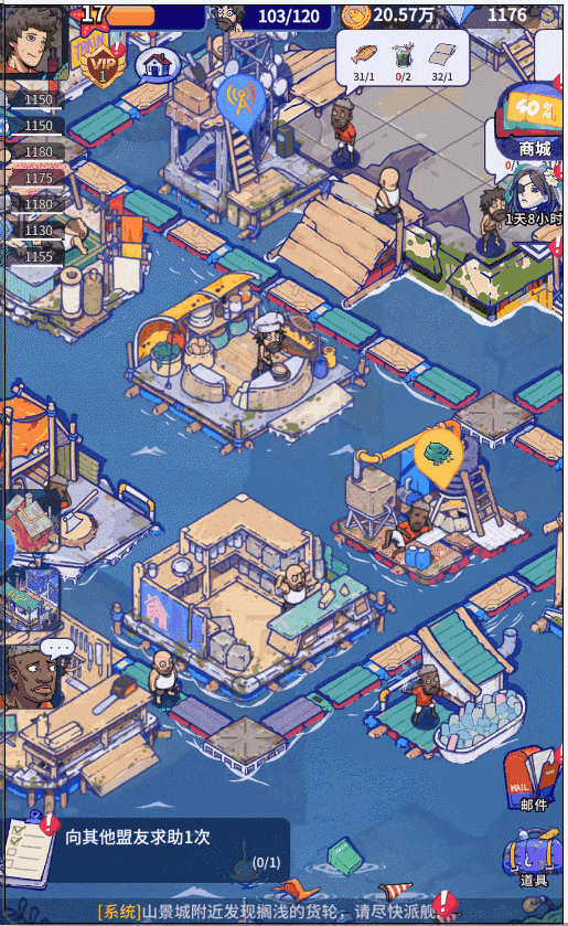 《疯狂水世界》将“联盟”与“世界”这两个和城战相关的核心功能放在了16级解锁,并在前期设置了比较严格的等级进度卡点和有限的经验产出途径。这使得玩家在进入游戏之后的数小时甚至一天之内,体验几乎完全集中于模拟经营之上。