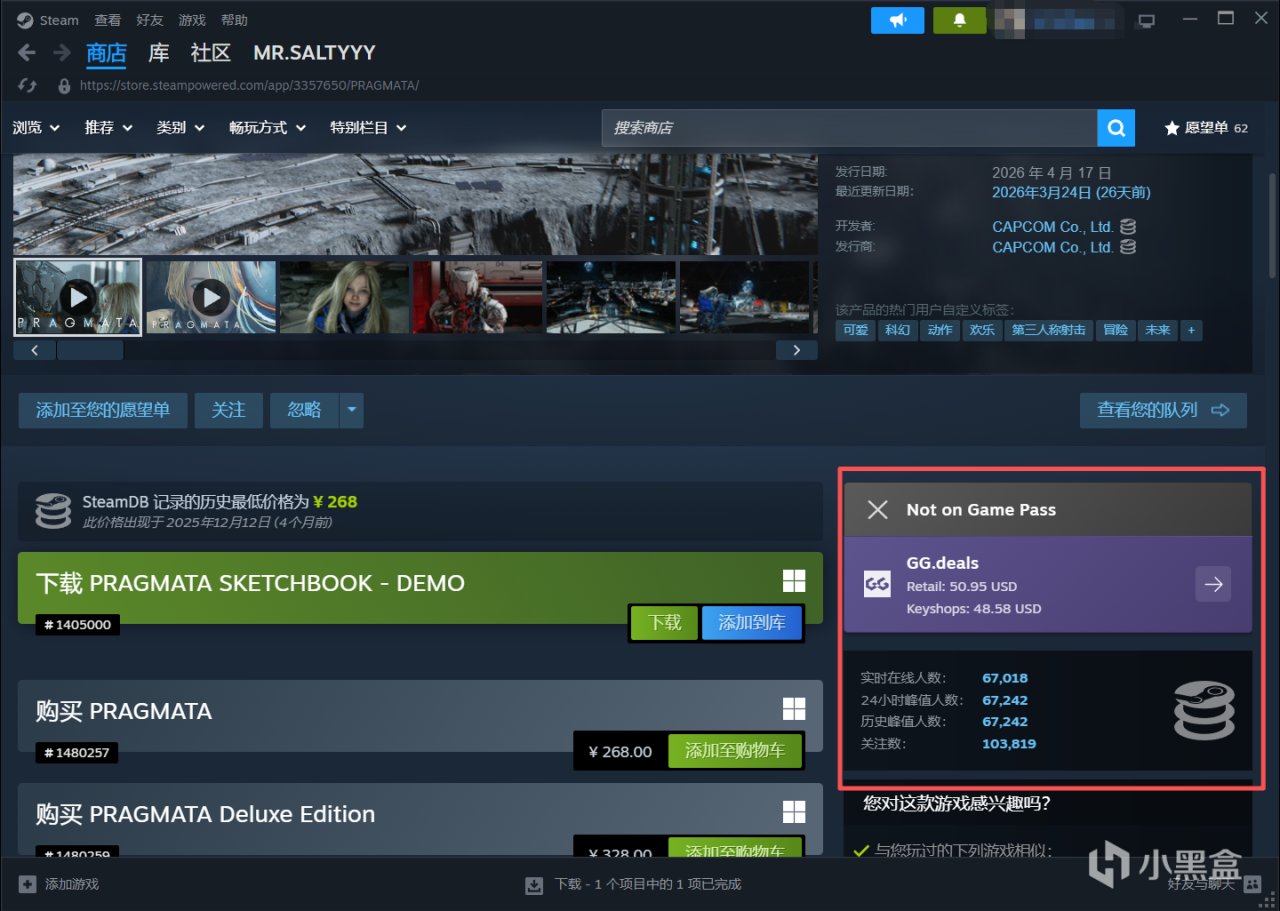 第七步,把Steam浏览器关掉,回到Steam客户端内看一下你的插件有没有生效。比如我这里装的是 Steam DB 和 Is It On Game Pass 这两个插件,这个时候,我就可以在 Steam 商店的游戏页面里面看到这款游戏的 SteamDB 信息和游戏是否有上 Game Pass 了。