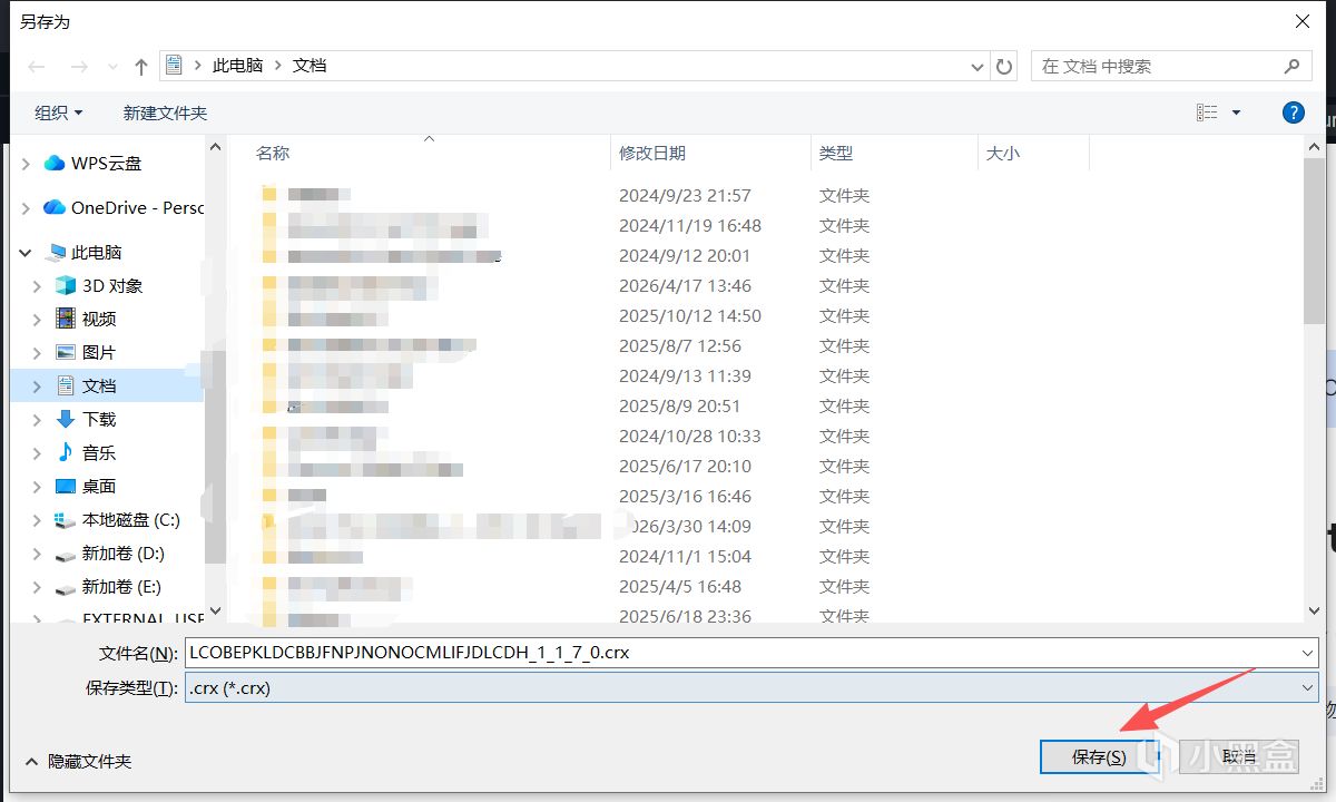 第五步,系统会跳出一个另存为的窗口,这里是需要我们将插件保存到电脑的文件夹里面,这里选择任意的文件夹即可,默认一般选择的是 C 盘的文档文件夹,点击保存。