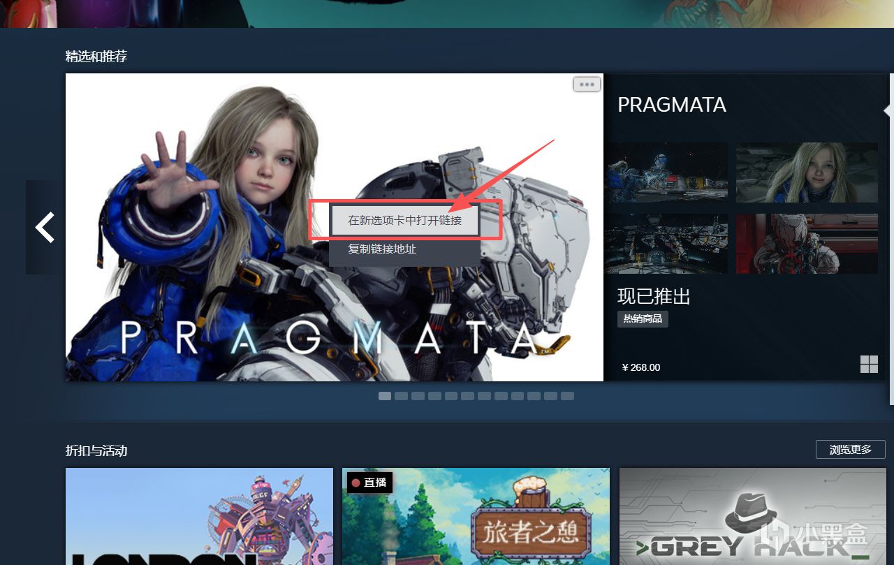 第一步,随便打开 Steam 的任意一个页面(以商店为例),右键点击任意一个游戏的跳转页面,选择以新选项卡打开链接。