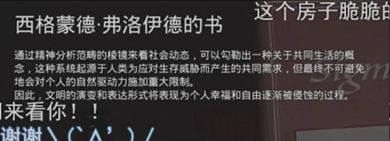 《恶意取关》中曾经出现过一个让很多摸不着头脑的道具:《精神分析论》,一本来自作家西格蒙德·弗洛伊德的书。为了防止“丈育玩家(比如说我)”没听过这个理论,游戏还亲切地附上了这本书的核心理论:“文明的演变和表达形式将表现为个人幸福和自由逐渐被侵蚀的过程。”