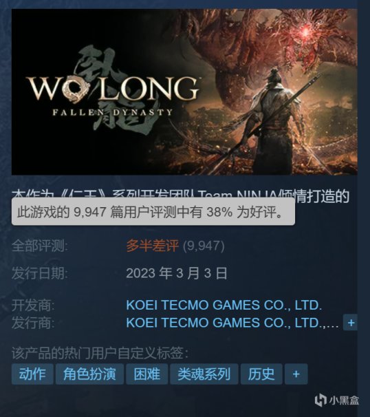 据悉,自从3月3日《卧龙》发售以来,因优化、键鼠操作、移植拉跨等问题,差评不断,截止本文发出,游戏在Steam上的评价为”多半差评“,好评率仅38%。