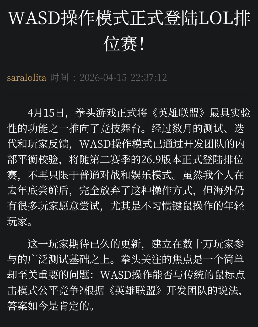 這次更新是拳頭在“保持MOBA核心”的前提下,向動作遊戲和現代輸入方式的一次大膽靠攏。WASD+手柄的組合,真正讓《英雄聯盟》從“鼠標黨專屬”變成了“鍵盤、鼠標、手柄三開”的全民遊戲。