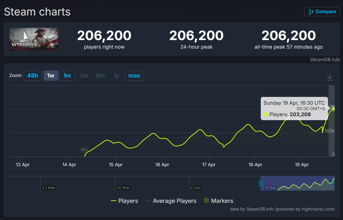 对于Steam上的游戏来说,同时在线人数的峰值超过20万,毫无疑问属于爆款了。不得不说,Pocketpair这个发行商确实是慧眼识珠,《风启之旅》可以说是重现了当年《幻兽帕鲁》的盛况。