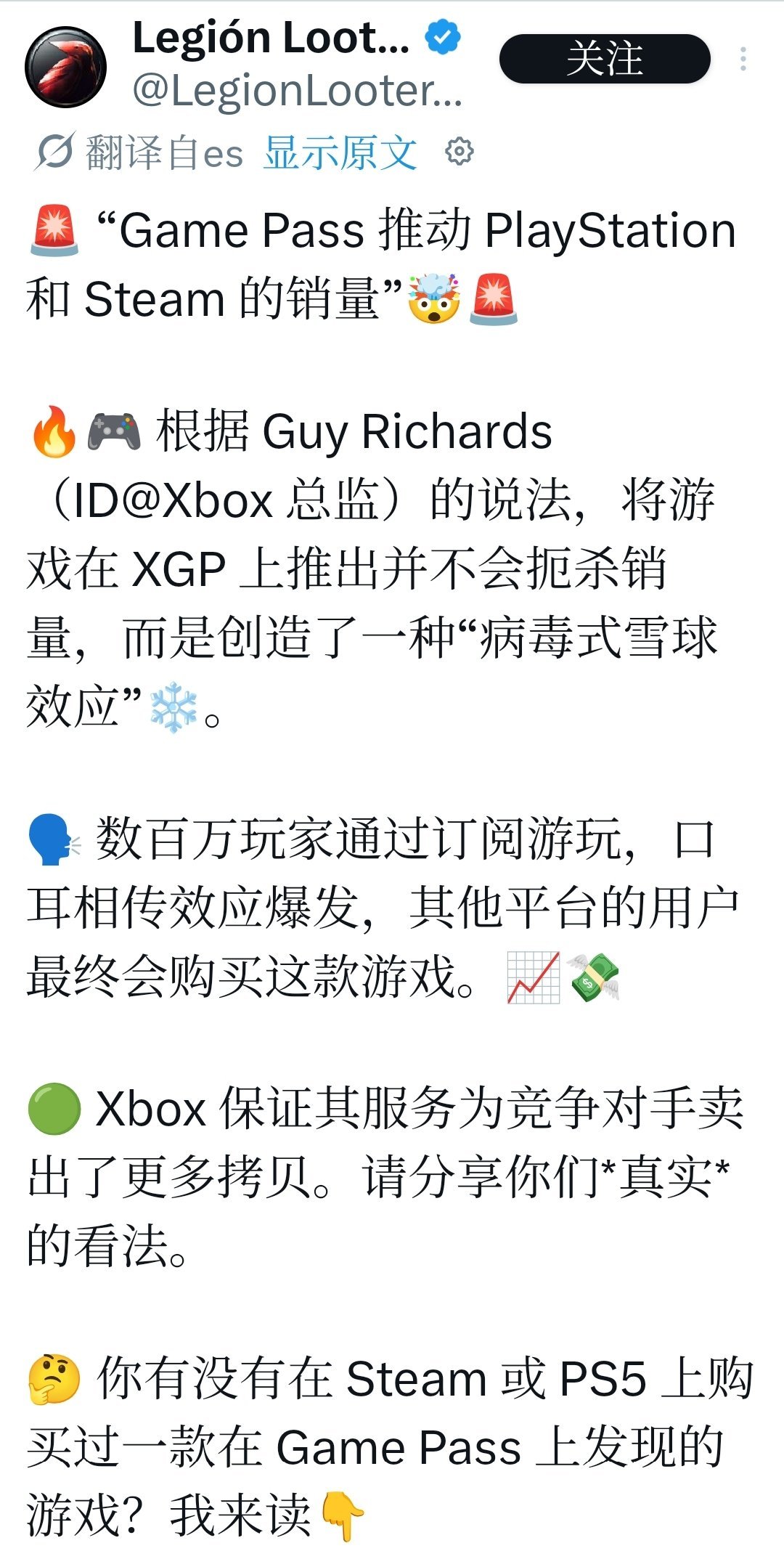 但 Xbox 认为这是“短期阵痛换长期生态”。Richards 的观点是:曝光带来的“雪球”最终会反哺全平台,而不是只在 Xbox 生态内循环。