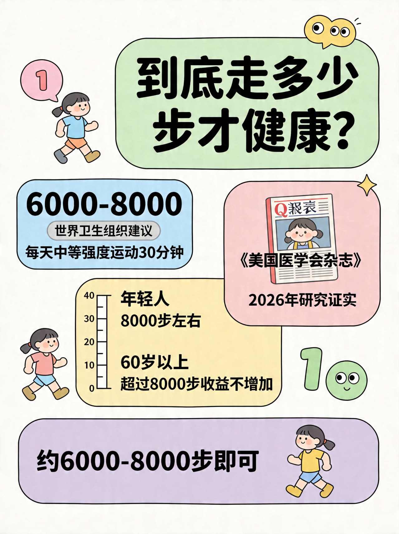 > 对60岁以上人群来说,每天走6000-8000步,就能获得最大的健康收益。超过这个数字,健康收益不再增加。