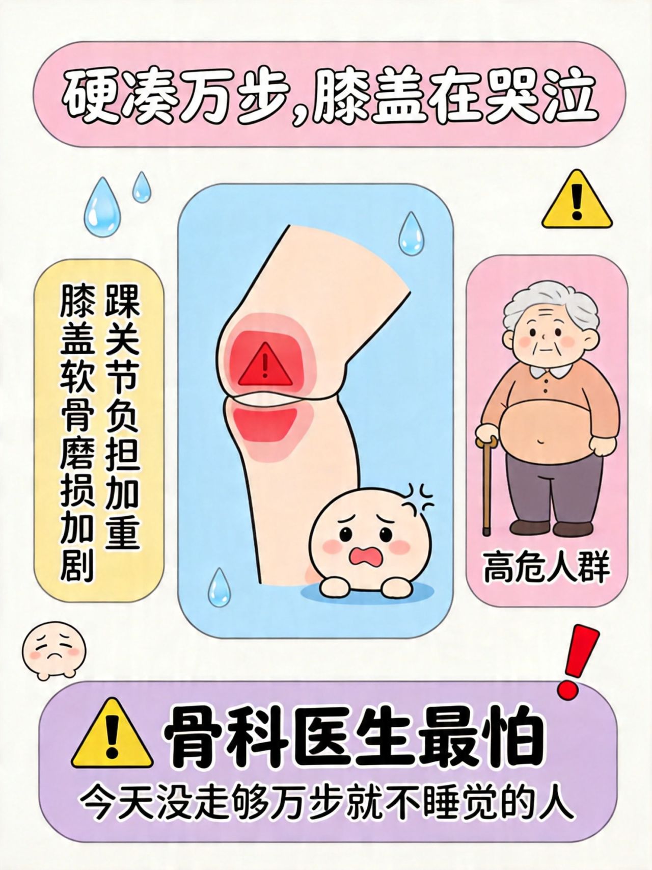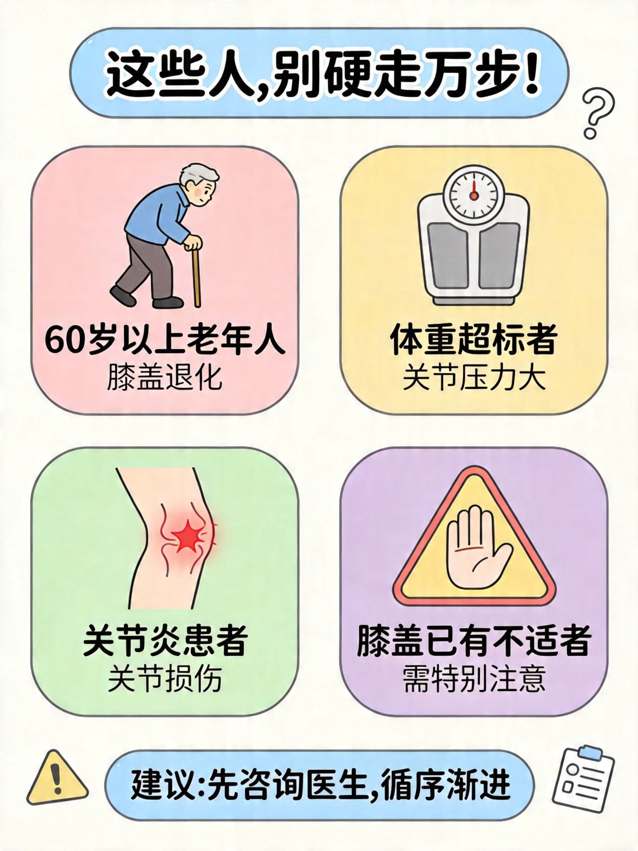- 60岁以上老年人:膝盖本来就退化,硬走加速磨损