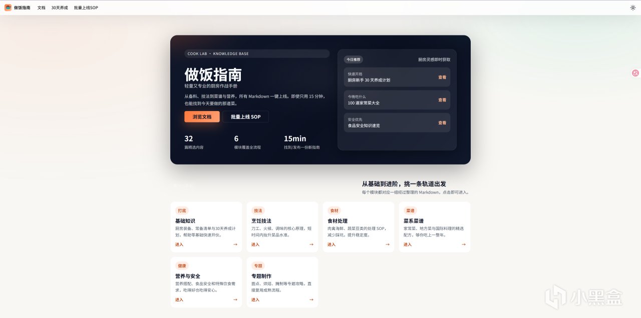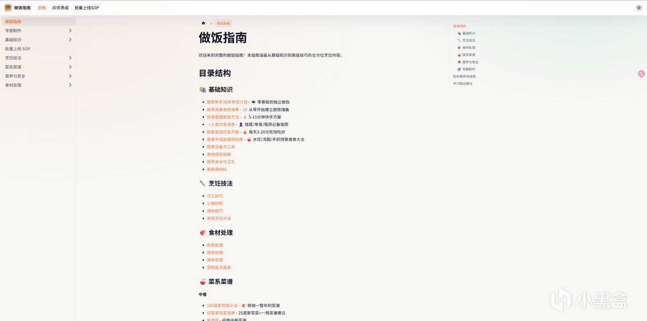 平台采用 Markdown 编写,页面干净、加载快、阅读舒适,内容覆盖家常菜、地方菜、烘焙、面点、腌制等多种类型,足够长期使用。不管是新手学做饭、上班族快速备餐,还是想提升厨艺,都能在这里找到清晰指引,让下厨变得简单、稳定、不翻车。