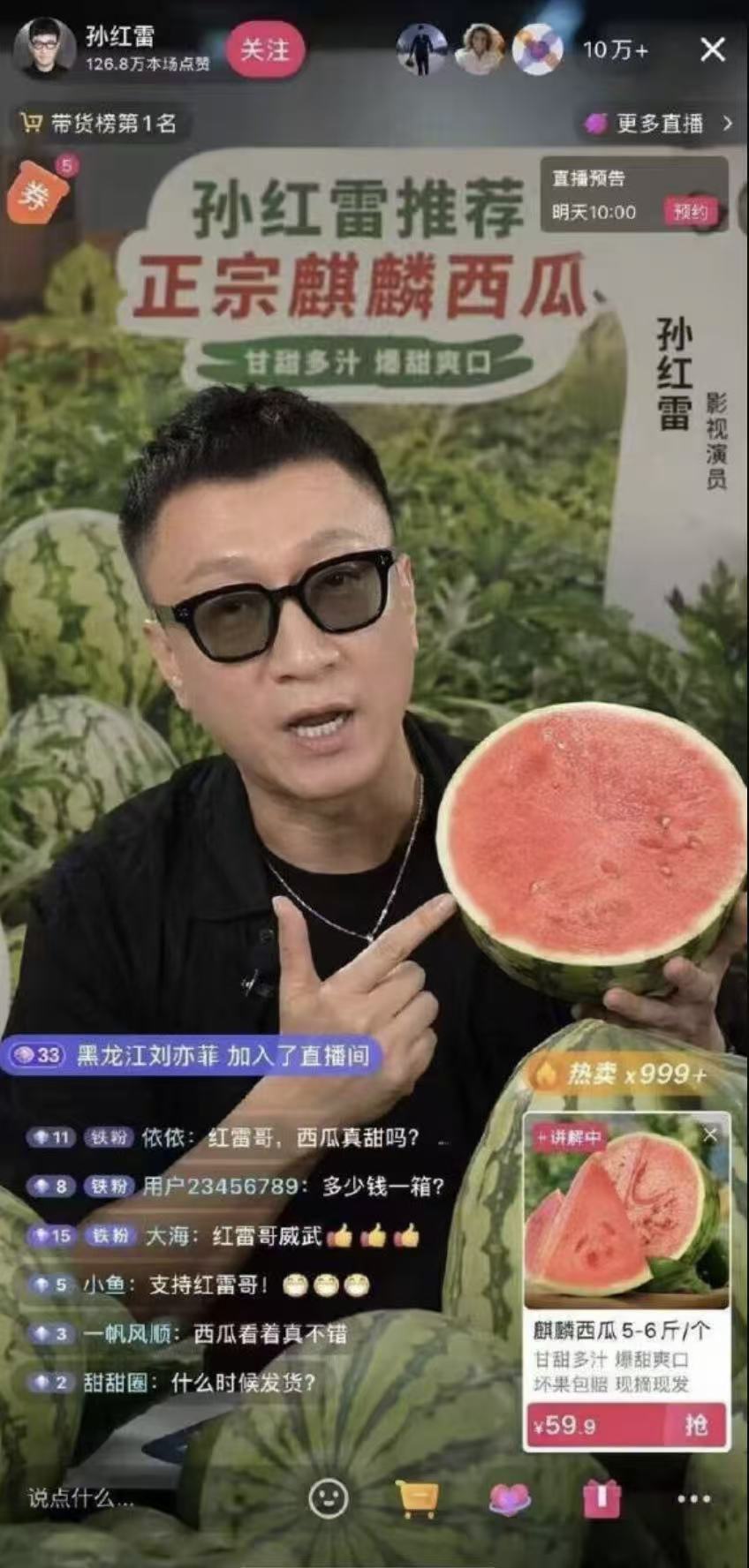 近日,網上流傳一張演員孫紅雷化身帶貨主播現場售賣精品西瓜直播截圖,憑藉經典“買瓜”梗引爆全網熱度。