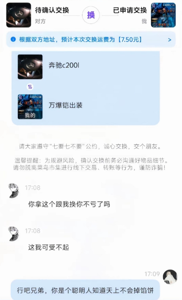 那么,有没有毫不藏私,坦诚相待的呢?当然有了。比如这位使用万爆铠出装交换奔驰C200l的,不亚于使用焚诀交换人阶下品法宝,因此面对这种共识,奔驰车主也是相当直白地表示“你拿这个跟我换你不亏了吗?”——这才是真正的绝顶聪明。