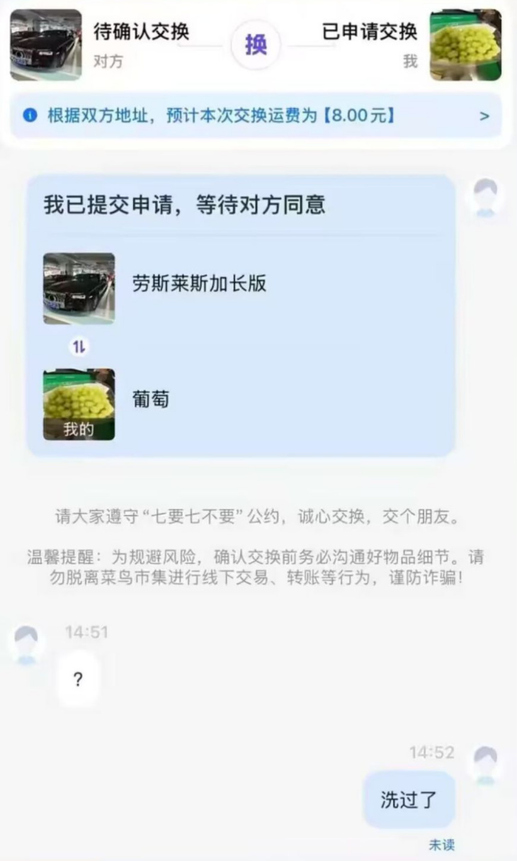同理,这还有这个用葡萄换劳斯莱斯加长版的朋友,当他提出交换后,对方的第一反应就是“?”,而葡萄所有者在此之后才把“洗过了”这一关键要素点出,真可谓百密一疏,也难怪对方没能同意交换,把劳斯莱斯砸手里了。