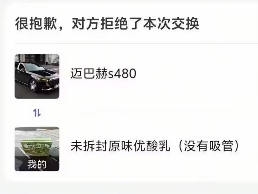 不过,价格不匹配只是其一,说不定人家就是不喜欢满级熊大呢?你要是有个猫鼠快跑的账号,没准真就换成了。类似的,就像是这个使用未拆封原味优酸乳(没有吸管)交换迈巴赫S480惨遭拒绝的案例。
