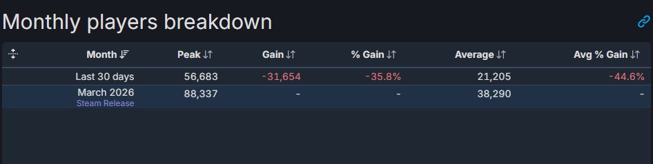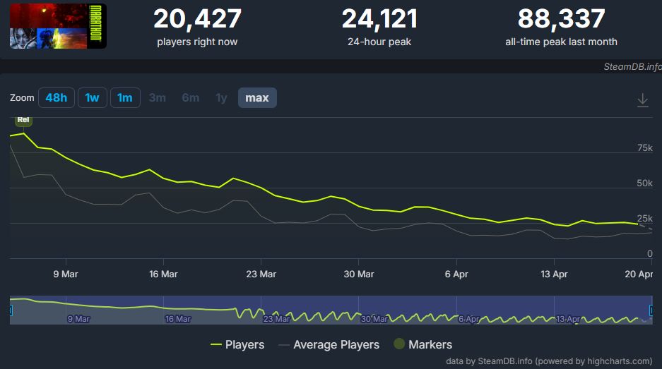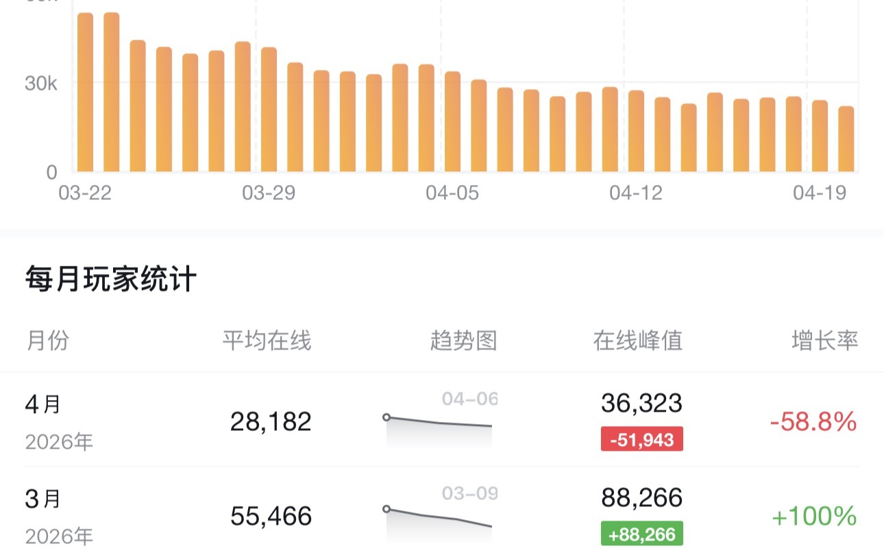 由 Bungie 旗下的 3A 級撤離射擊新作《失落星船:馬拉松》在上線僅一個多月的時間裏,就經歷了過山車式的熱度滑坡。遊戲首發 Steam 峯值 8.8 萬。發售一週後,玩家數跌至 5 萬: