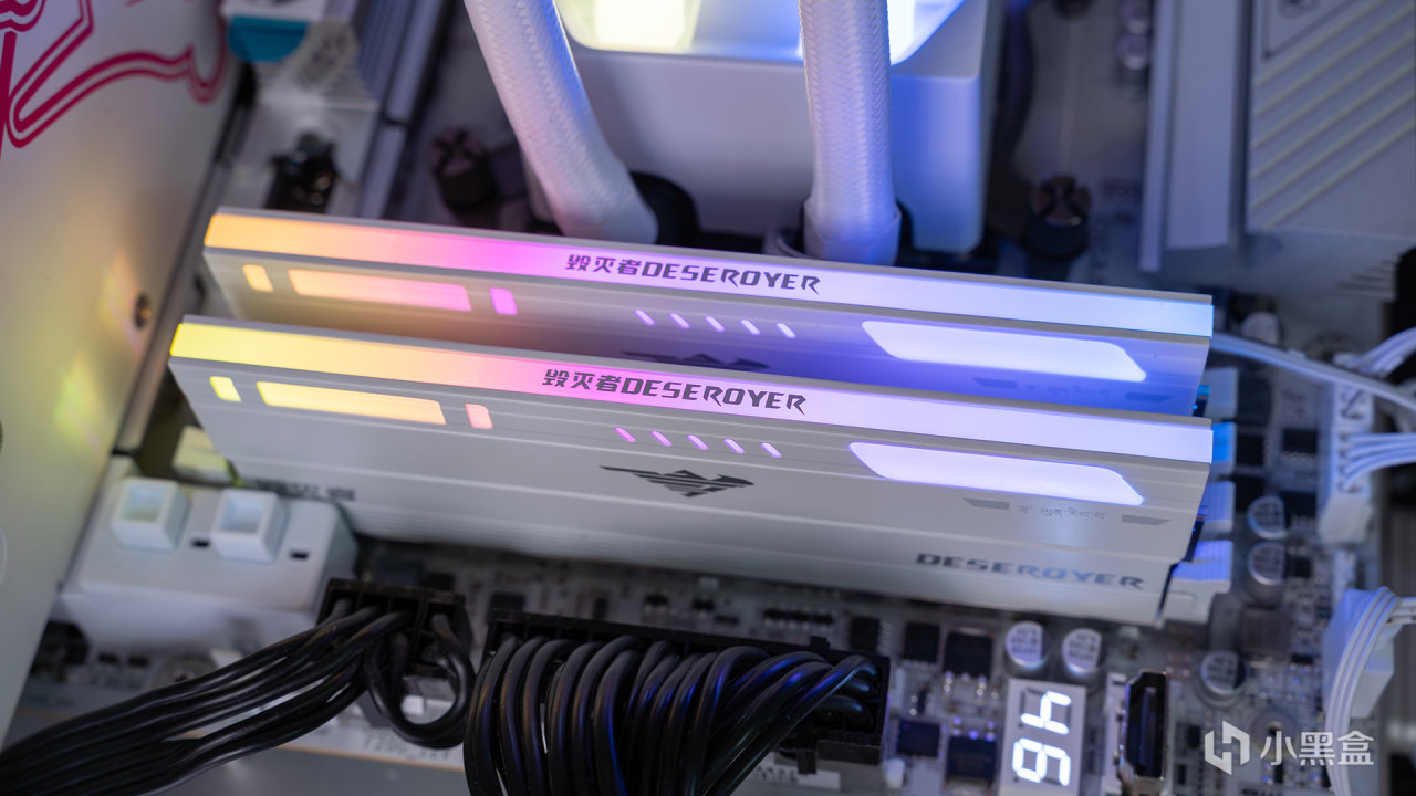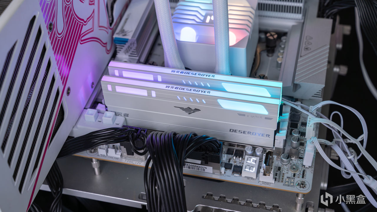毁灭者锦衣卫DDR5 6000C30霜白款,基于白色磨砂质感处理的散热装甲,表面还有规则线条和LOGO品牌元素装饰,从侧面视角欣赏,还能看到一些不规则导光层,整体偏向硬朗的机甲风格,能和热门的海景房装机完全契合。