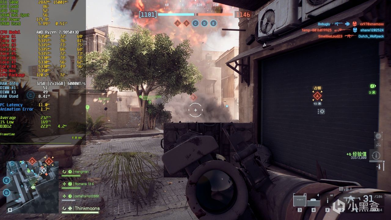 1080P《战地风云6》预设低画质,征服模式实际游玩平均帧数可达到232fps,1% LOW帧则是169fps,就连1% LOW帧这种代表着“持续卡顿感”的指标,也是完美达到了高刷标准。