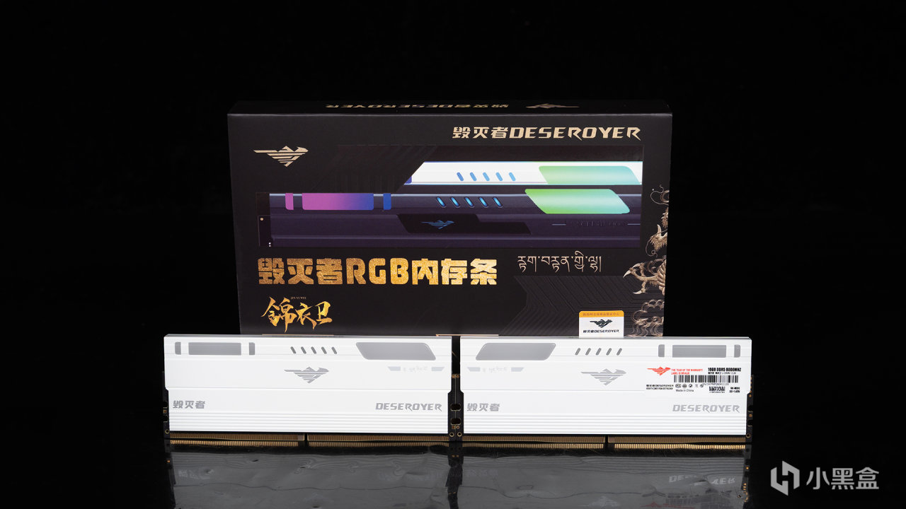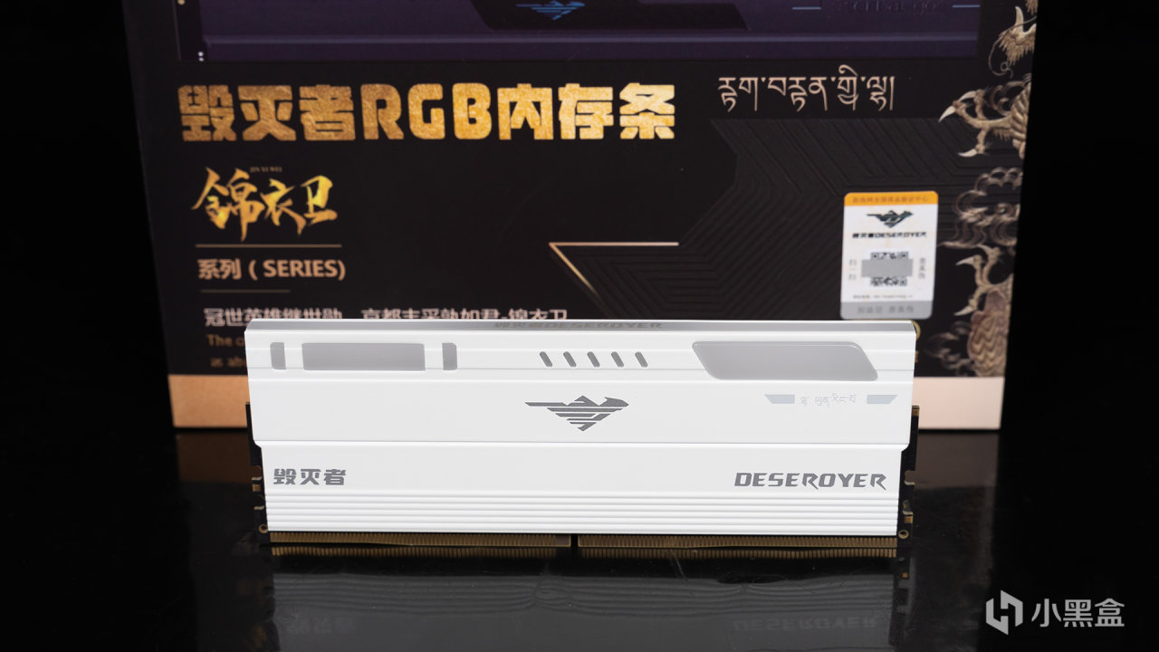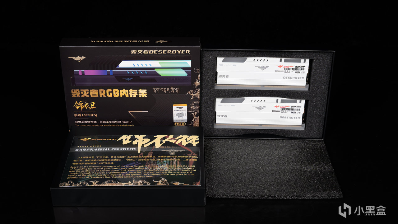毁灭者源于存储大厂精亿(JinGYI)旗下的高端电竞品牌,包装设计也是采用精致的彩印礼盒打造,正面有着锦衣卫内存的3D渲染图,下方还有金标和金边元素装饰,这款内存分为霜白和曜蓝两个颜色版本可选。