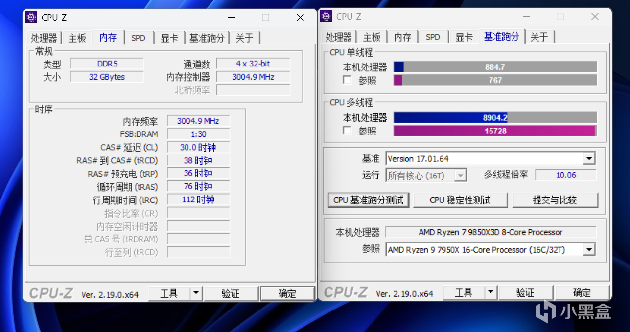 CPU-Z跑分,9850X3D单线程达到884.7,多线程则是8904.2,搭配毁灭者锦衣卫DDR5 6000C30这套内存,性能得以发挥完全。