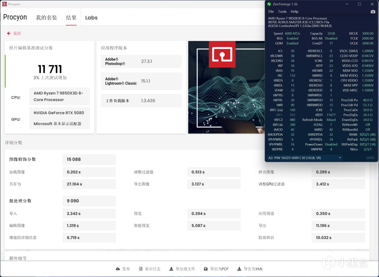 Procyon照片编辑(PS和LR)基准分数为11711,细看下来,调整过滤器、拼合图像、预览、应用预设等频繁操作都在一秒内可完成,对于内容创作者来说响应是非常迅速的,内存低时序调教对于PS和LR均有一定加成作用的。