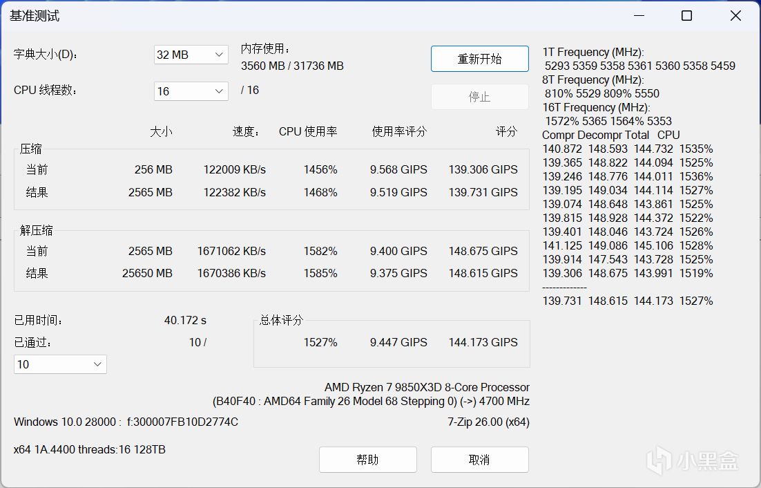 对于大部分玩家日常所能接触的生产力——7-Zip基准测试,其压缩评分能达到139.306 GIPS,解压缩评分则是148.615 GIPS,6000C30低时序调教可以明显提升压缩速度,而32GB容量面对大批量文件压缩时也从容。
