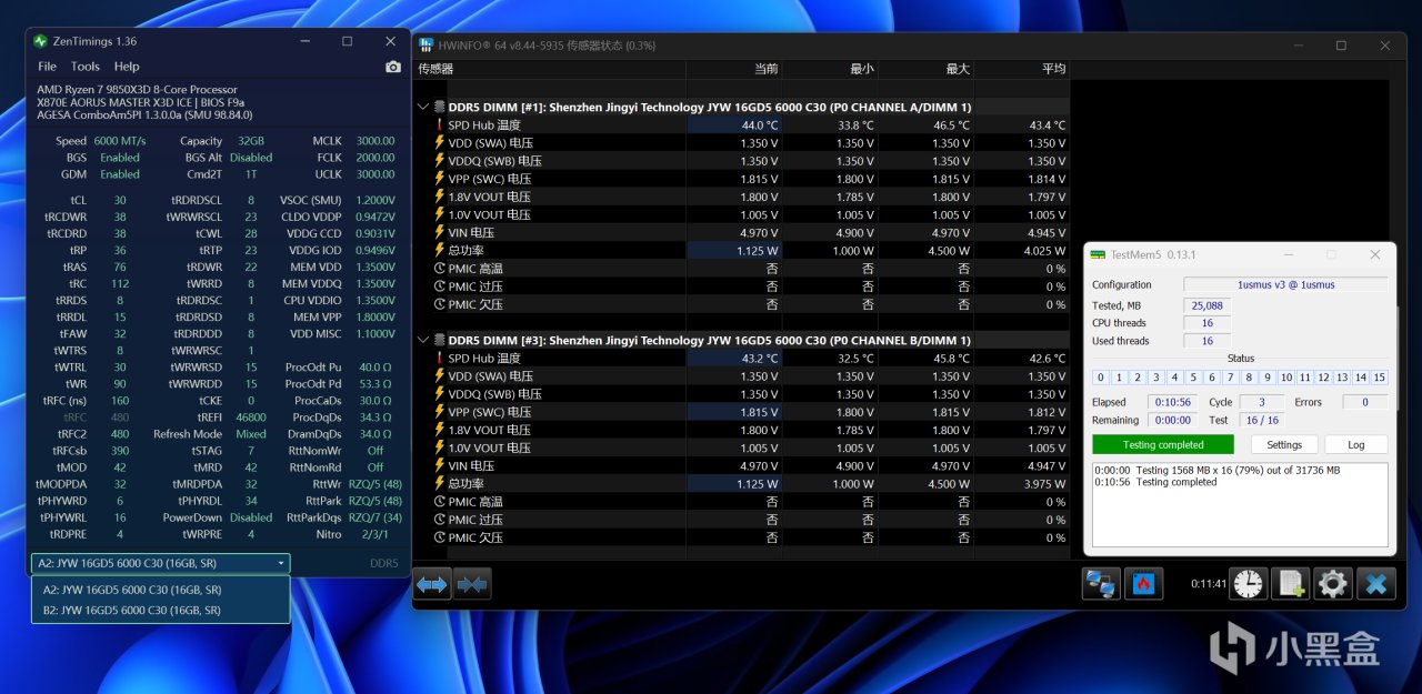 如果你手上也有技嘉的AM5主板,可以试试BIOS内的XMP&EXPO高频宽技术,该项技术会在XMP&EXPO基础上优化内存小参(不改变内存频率),达到一键提升内存性能的效果,实测毁灭者锦衣卫DDR5 6000C30开启可以在无风扇辅助下,通过TestMem5三轮烤机测试,内存最高温度约44℃。