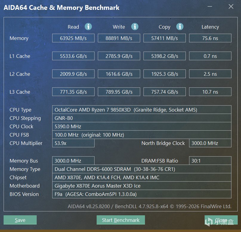 AIDA64内存和缓存测试,搭配9850X3D读取能达到63925 MB/s,写入则是88891 MB/s,复制达到57411 MB/s,内存延迟控制在75.6ns,横向对比目前同样定价的6000C36、6000C38,毁灭者锦衣卫DDR5 6000C30这款内存表现可要好上不少。