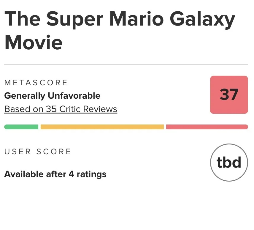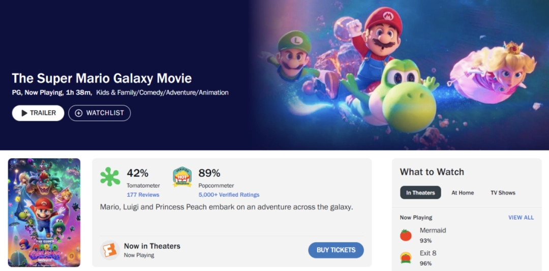 早在观影前数天,我就注意到了《超级马力欧银河大电影》在烂番茄上两极分化的评价——烂番茄新鲜度仅有42%,媒体侧几乎清一色地给出差评,但与之相对的,其爆米花指数却高达89%,影评人与观众的评价落差之大,相较初代《超级马力欧大电影》有过之而无不及。
