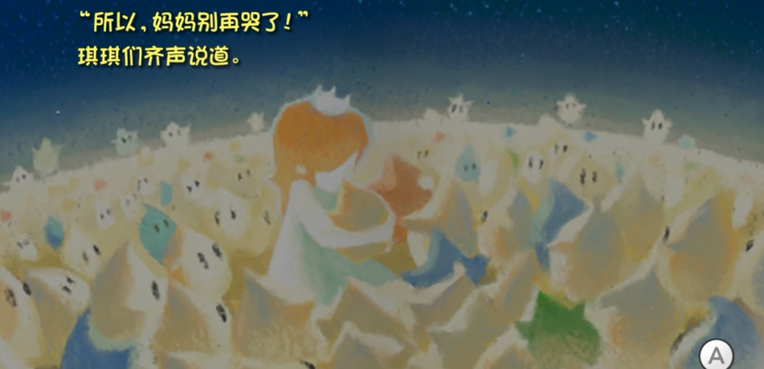 她在给她的孩子,也就是琪琪们讲马力欧的冒险故事。紧接着,她在自己孩子们的面前被绑走了——要知道,初代《超级马力欧银河》绘本里的琪琪,为了不让罗莎塔再哭泣而化作了长尾星,琪琪们和罗莎塔的感情可谓是情深义重了。