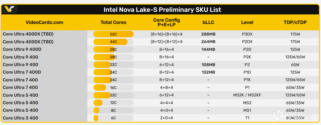 带 DX 的 HEDT 工作站版 Core Ultra 400DX:双芯片设计,最高 16P+32E+4LP E,共 52 核,双 bLLC 缓存,总容量 288MB。