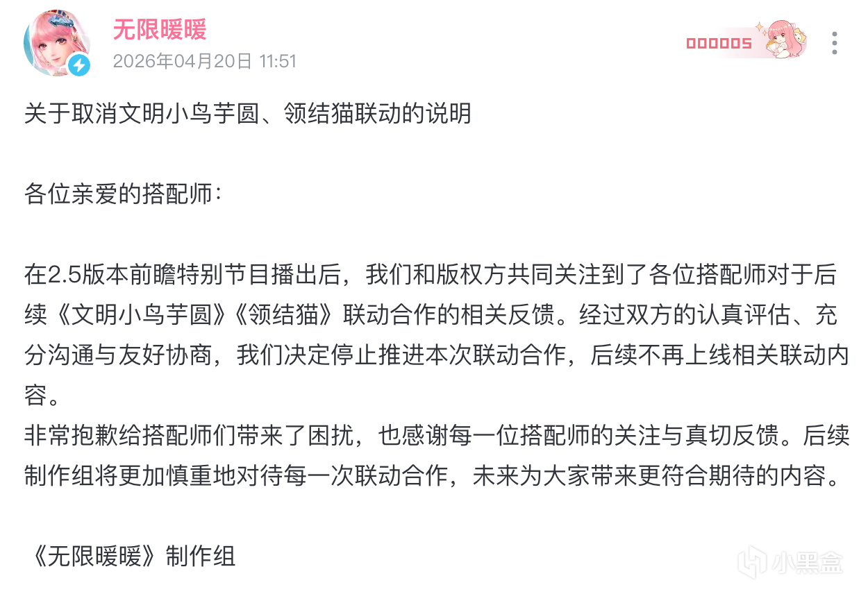 4月20日,叠纸旗下开放世界冒险换装游戏《无限暖暖》官方发布公告,宣布正式停止推进与表情包IP《文明小鸟芋圆》及《领结猫》的联动合作,后续将不再上线相关联动内容。