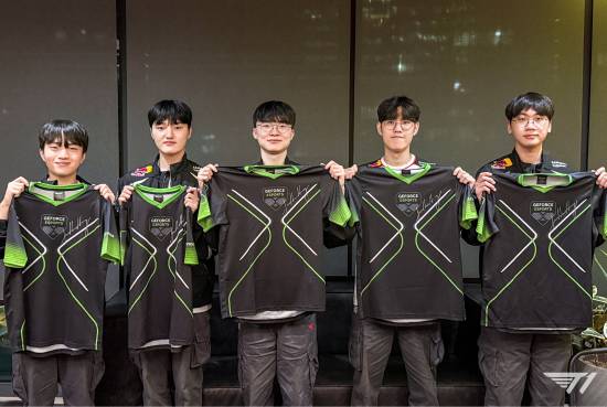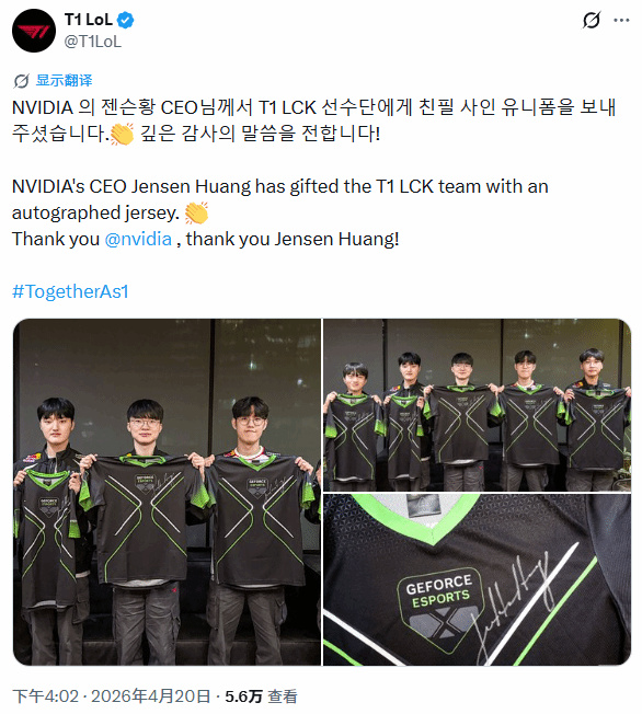 4月20日,《英雄联盟》T1战队官方晒出照片,NVIDIA CEO黄仁勋向全队赠送亲笔签名的GeForce Esports主题战袍。