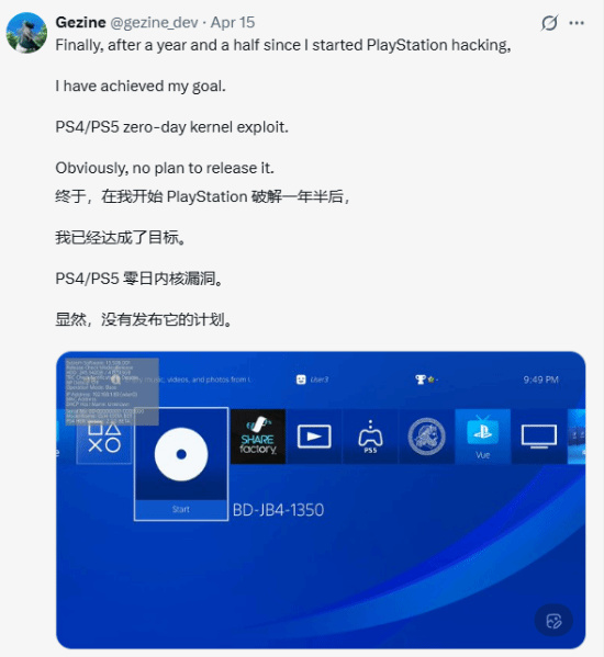 4月15日,韓國PS破解圈的老熟人Gezine,在社交平臺上扔出了一顆重磅炸彈。他明確表示,自己已經同時拿下了PS4和PS5的系統內核,還找到了一個索尼完全不知情的零日漏洞——簡單說就是,索尼連漏洞在哪都不知道,更別提修補了。圈內人都清楚,能摸到主機系統內核,就相當於拿到了PS5的“萬能鑰匙”。